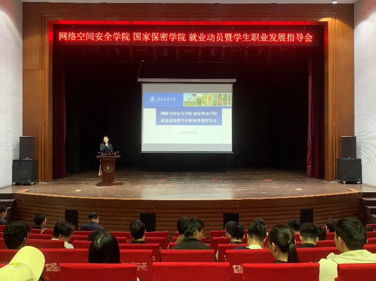 安志强围绕总体就业环境、学院本研学生就业情况、就业关注要点三个方面,介绍了近年来国家学校总体就业形势、升学深造情况以及学院毕业生就业去向,针对学院本科生、研究生的就业特点进行了择业指导,推荐了与学院重点合作的有网络安全方向用人需求的企事业单位。