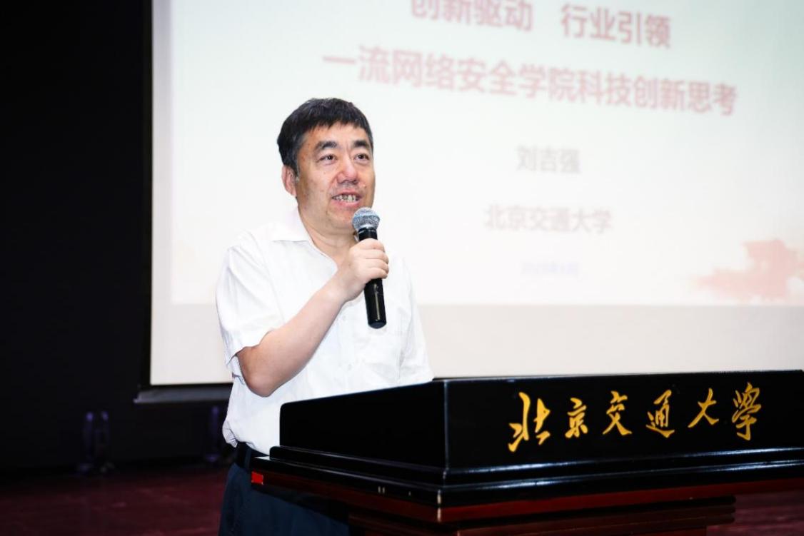 刘吉强以《创新驱动、行业引领,一流网络安全学院科技创新思考》为授课主题,从专业设置、教学成果、科研成就等几个方面回顾了学院发展历程,结合当下网络空间安全领域蓬勃发展的态势,围绕一流网络安全学院建设进行了生动详细的阐述,深入剖析行业前景与挑战,勉励同学们传承网安学院创新奋进的精神,扎根网络安全行业建功立业。