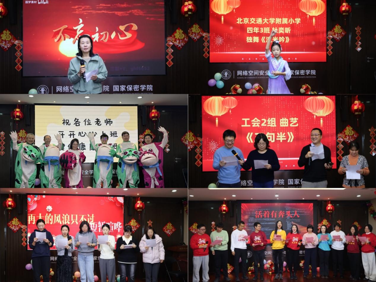 学院老领导杨晓晖一曲《不忘初心》,歌声深情而坚定,引发了全场共鸣。交大附属小学杜奕昕同学表演的舞蹈《流光吟》,舞姿优美,为现场增添了灵动与童趣。工会一组的活力舞蹈《消气操》瞬间点燃全场热情;工会四组的合唱《一路生花》旋律优美,寄托了对未来的美好期许;工会二组的曲艺《三句半》语言幽默、编排巧妙,展现了学院的工作生活点滴;工会三组的大合唱《越来越好》气势恢宏,唱出了全院上下团结一心、砥砺奋进的豪情壮志,共同祝愿学院越来越好。